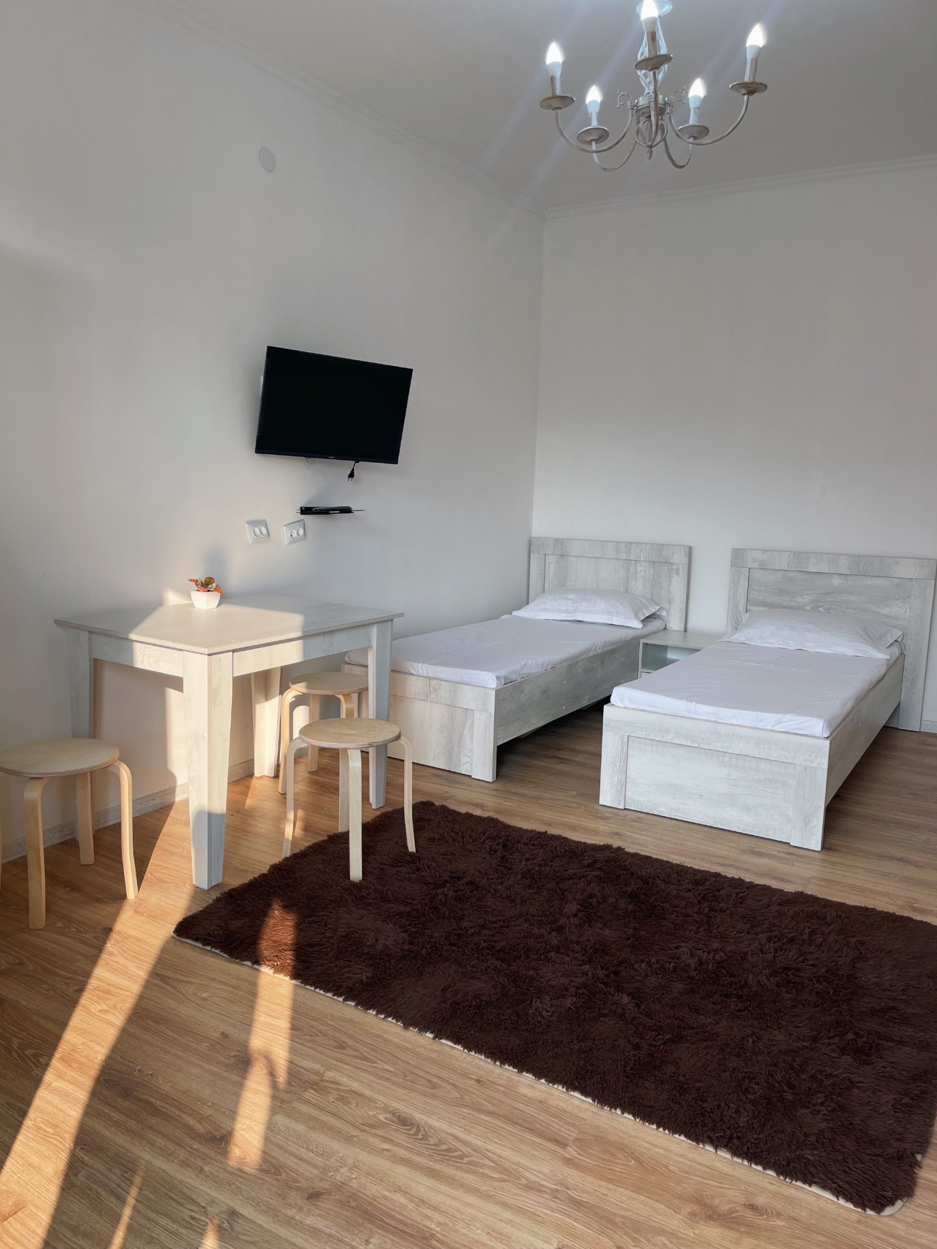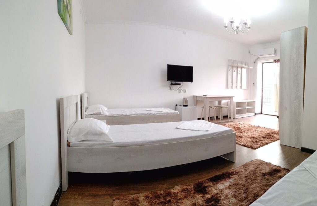 Оснащение номера: кондиционер, wifi, туалет, душ, раковина, тумба, телевизор, холодильник, шкаф, стол, кровати, чайник, 2 мест, 2 односпальные кровати и диван на 2 чел. Каждый номер имеет отдельный выход.