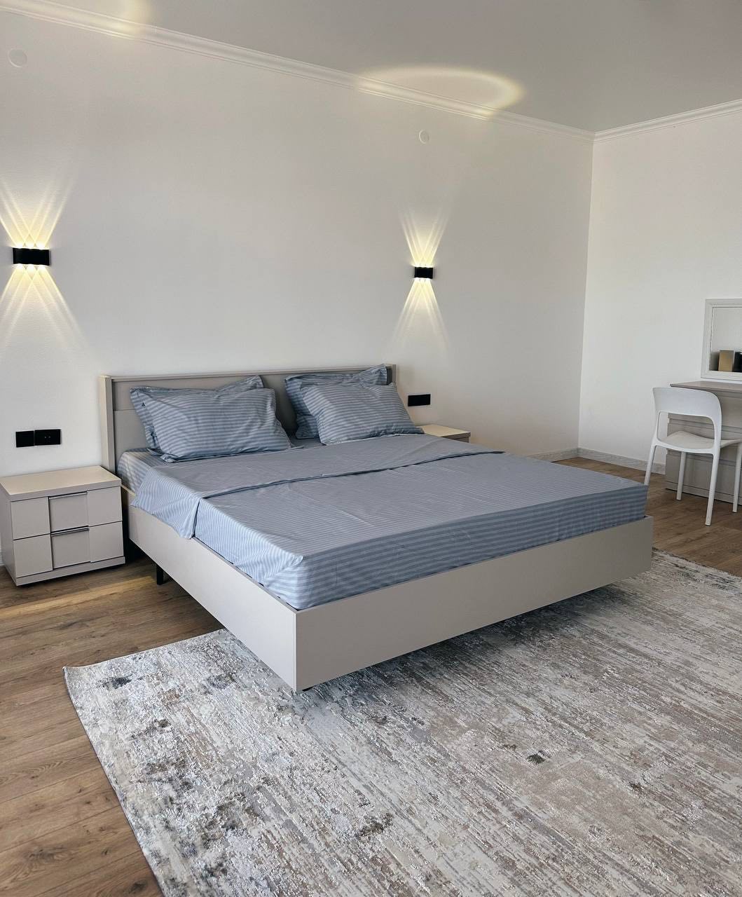 2 местная кровать в одной комнате, в другой комнате диван на 2 человек. Оснащение номера: кондиционер, wifi, туалет, душ, раковина, тумба, телевизор, холодильник, шкаф, стол, кровати, чайник, 4 мест. (2спальная кровать в спальной, диван на 2 чел в зале).