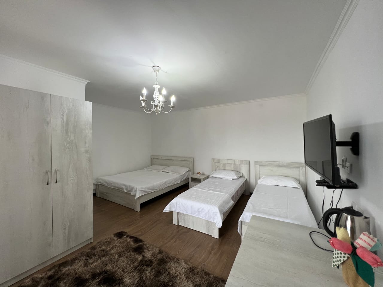 2 местная кровать + 1 местная в одной комнате, в другой комнате диван на 2 человека. Оснащение номера: кондиционер, wifi, туалет, раковина, телевизор, холодильник, шкаф, стол, кровати, тумбы, чайник, телевизор. Душ Аристон находится на территории в 10 м от номера.